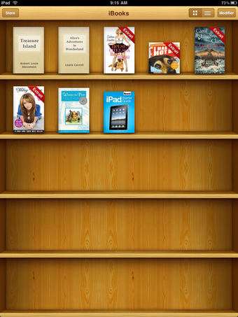 iBooks se présente sous la forme d'une étagère à la Delicious Library où sont rangés vos livres numériques, visibles grâce à leur couverture. Deux exemplaires gratuits sont fournis avec l'application: Winnie l'Ourson et le guide de démarrage de l'iPad, tous deux en anglais.