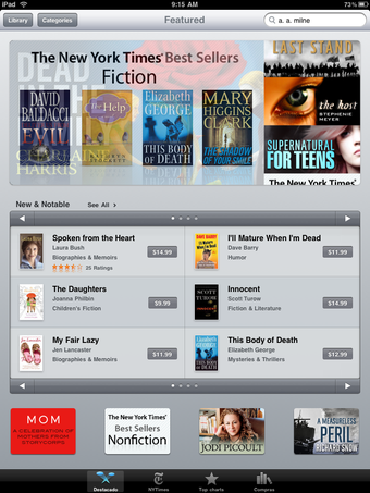 L'accès au Store par le bouton en haut à gauche de l'interface permet de se connecter à la plateforme de vente de e-books d'Apple pour enrichir sa bibliothèque. Cette dernière peut aussi se contenter d'afficher seulement les titres des livres téléchargés, triés par nom, auteur ou catégorie.